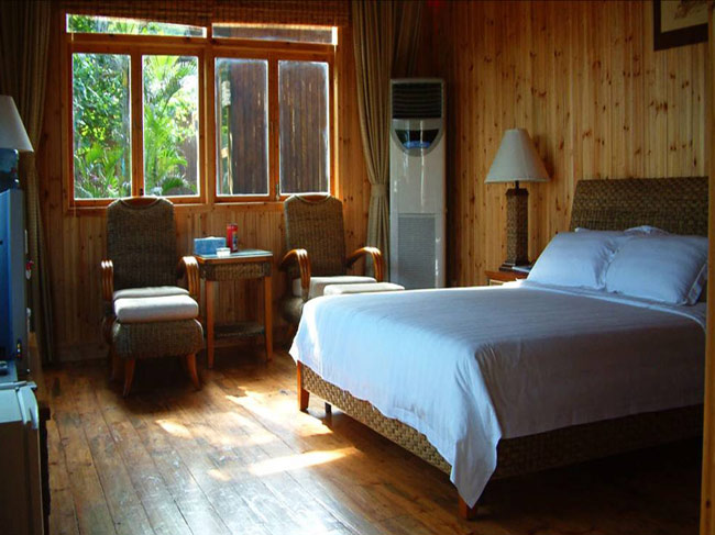 三亞蜈支洲島度假中心屬熱帶海洋性氣候,全年溫和氣爽,四季怡人。由于小島地處三亞海棠灣,避開了臺(tái)風(fēng)走廊,所以不同于一般只能生長灌木的北部小島,這里喬木高大挺拔,灌木繁茂葳蕤,如天然織就的一塊厚重的綠毯披在島上,麗質(zhì)天成。小島地貌美麗而有層次:島的中部坡地逶迤,起伏平緩,草木紛亂,藤蔓纏結(jié),花紫果綠,蟬噪鳥鳴。西部及北部平緩延伸入海,形成一彎路玉帶狀的銀色沙灘,沙質(zhì)均勻細(xì)膩,色澤潔白如雪,海水由淺入深,顏色由透明而碧綠繼而淺藍(lán),后而深藍(lán),明麗動(dòng)人層次分明。東部與南部則是現(xiàn)兩峰相連,最高峰海拔79.9米,其氣勢與洶涌仄相向,懸崖壁立如削,人跡難至,其下礁石林立,奇形萬狀,驚濤拍岸,泡沫如雪。大風(fēng)或大潮時(shí),海浪咆哮奔騰激起的浪花可高達(dá)十米,形成獨(dú)特的山海奇觀。小島現(xiàn)已被開發(fā)了三分之一,都位于西北部。建設(shè)者獨(dú)具匠心,巧妙地利用了地形地貌,使人工設(shè)施掩映期間,不減其風(fēng)采,反增其情趣。這里椰影婆娑,綠草成蔭,竹制建筑娉婷綽約,泳池碧波蕩漾。草地上小徑蜿蜒,點(diǎn)綴些秋千、蹺蹺板、石凳、竹制躺椅,編就了一幅世外天堂的畫面。