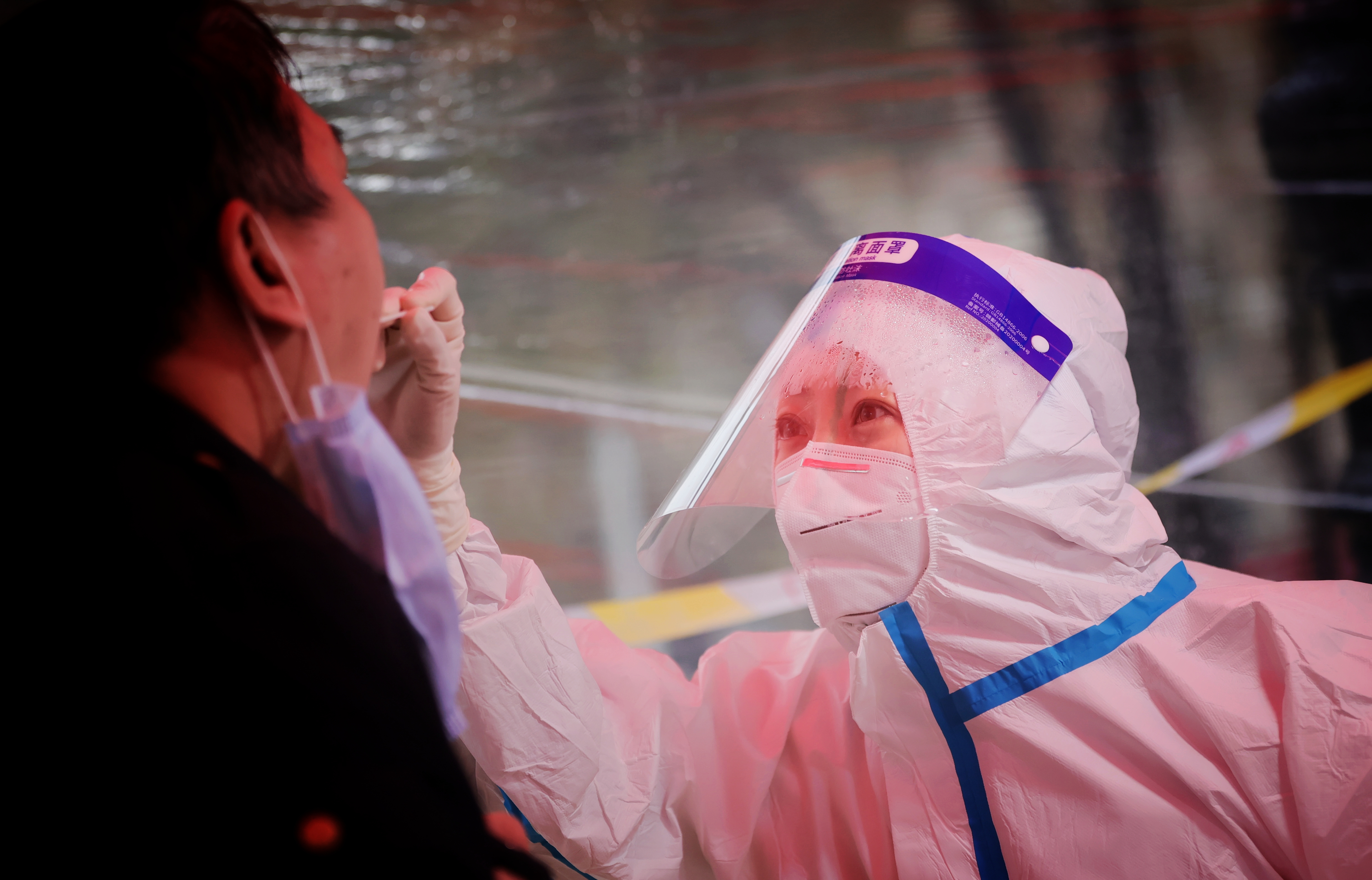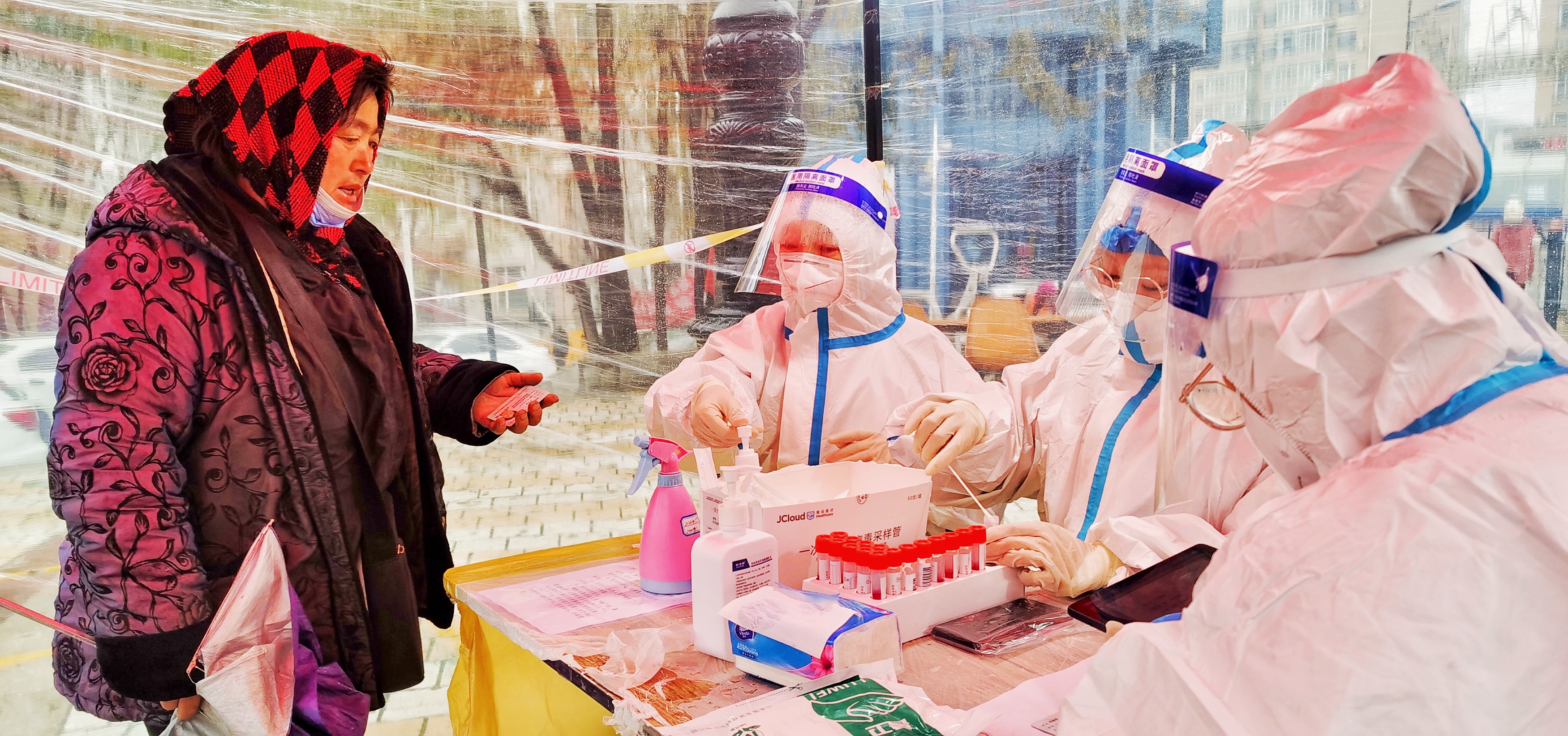 哈爾濱市第一人民醫(yī)院的醫(yī)護人員在核酸檢測取樣