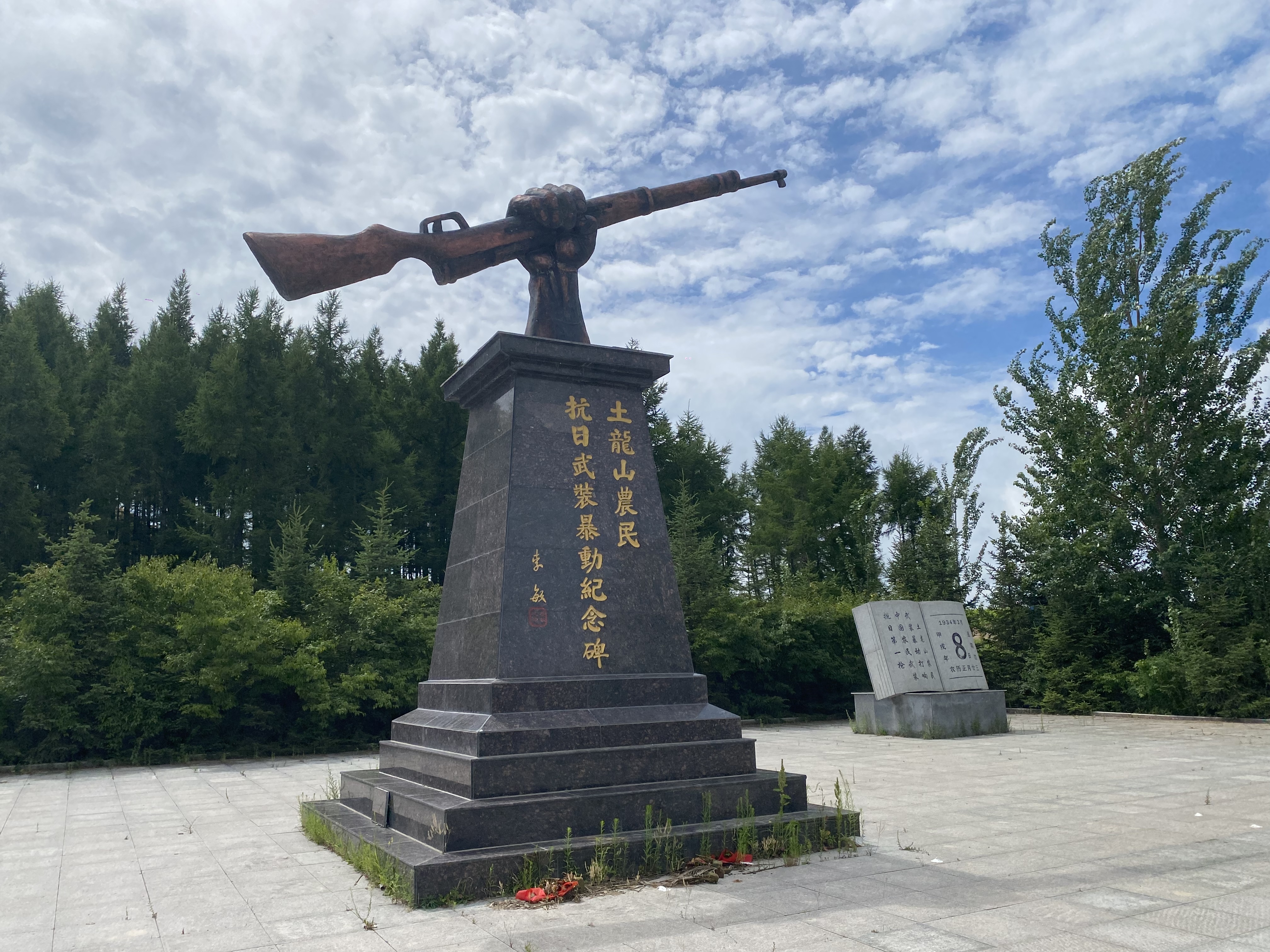在佳木斯市樺南縣土龍山鎮(zhèn)西側(cè)的開闊地帶,一座花崗巖紀(jì)念碑直刺蒼穹。碑頂,一只青銅鑄就的“巨手”沖破巖石的束縛,將一支“步槍”奮力擎向天際——這凝固的瞬間,正是1934年那個寒意料峭的初春,土龍山的怒吼。