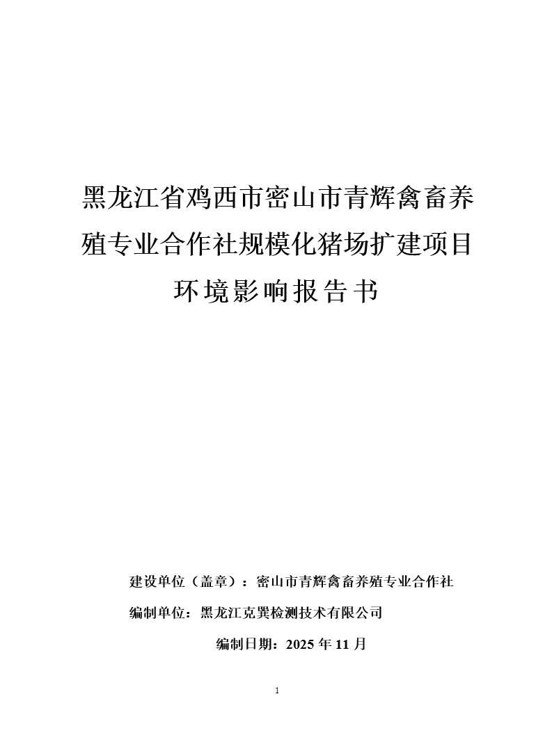 黑龍江省雞西市密山市青輝禽畜養(yǎng)殖專業(yè)合作社規(guī)?;i場擴(kuò)建項(xiàng)目環(huán)境影響報(bào)告書